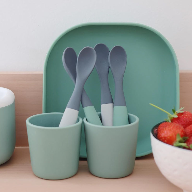 Set 4 lingurite silicon +4 luni Beaba Bicolor Mineral' - cu maner lung si cupa subtire, fabricate din 100% silicon: material sanatos, moale, durabil si silentios.