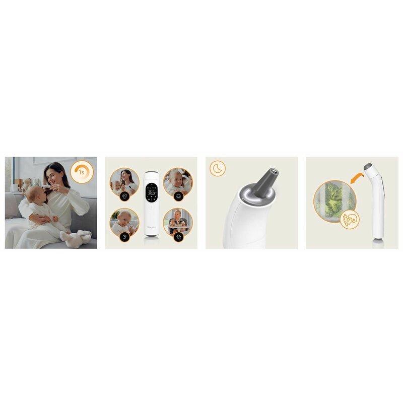 - Versatilitate: Potrivit pentru copii si adulti; proiectat pentru masuratori la ureche si frunte; adecvat pentru masuratori de temperatura ambientala si alimentara.