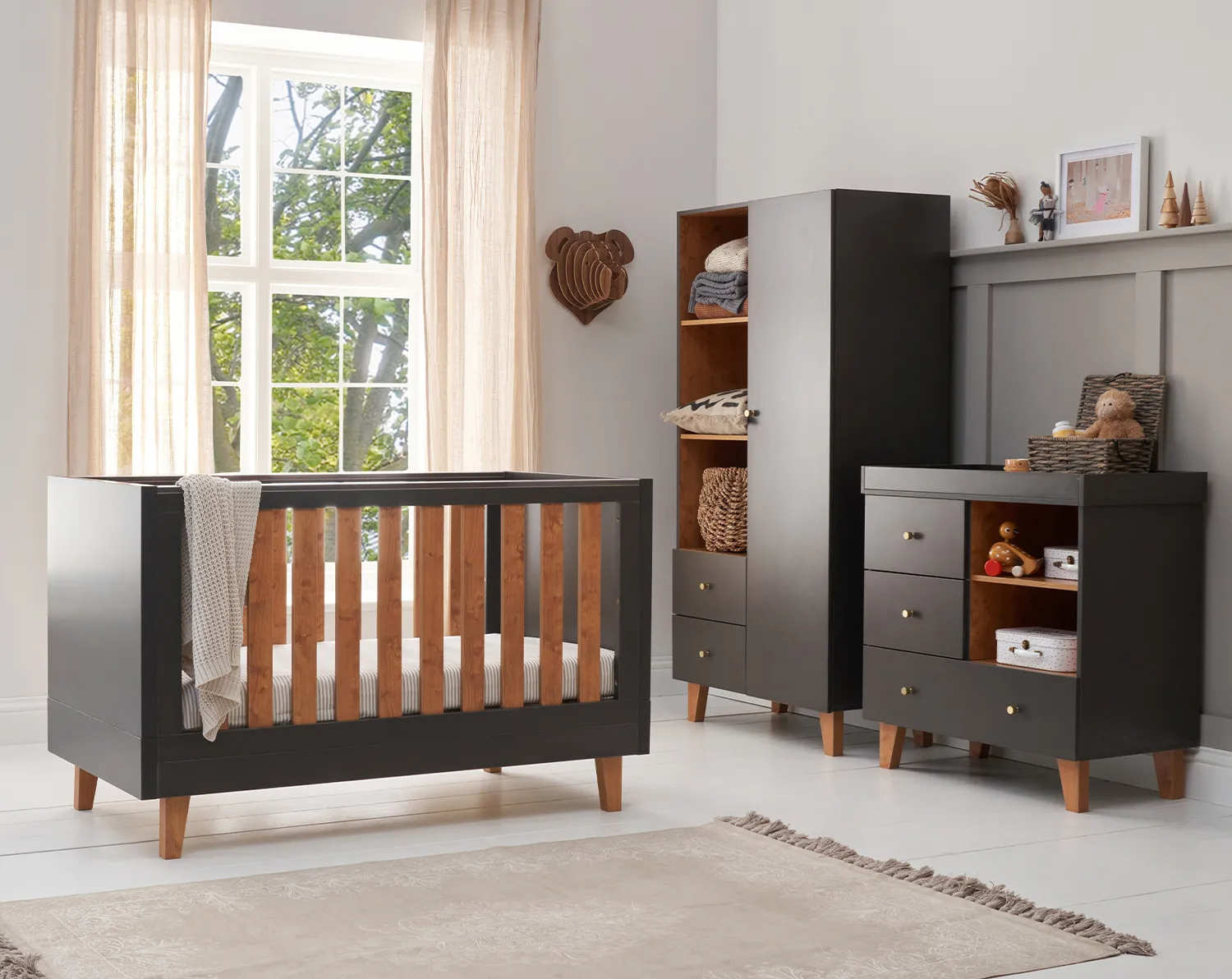 Patutul isi pasteaza aceleasi linii clasice si design rafinat, integrandu-se perfect in camera copilului