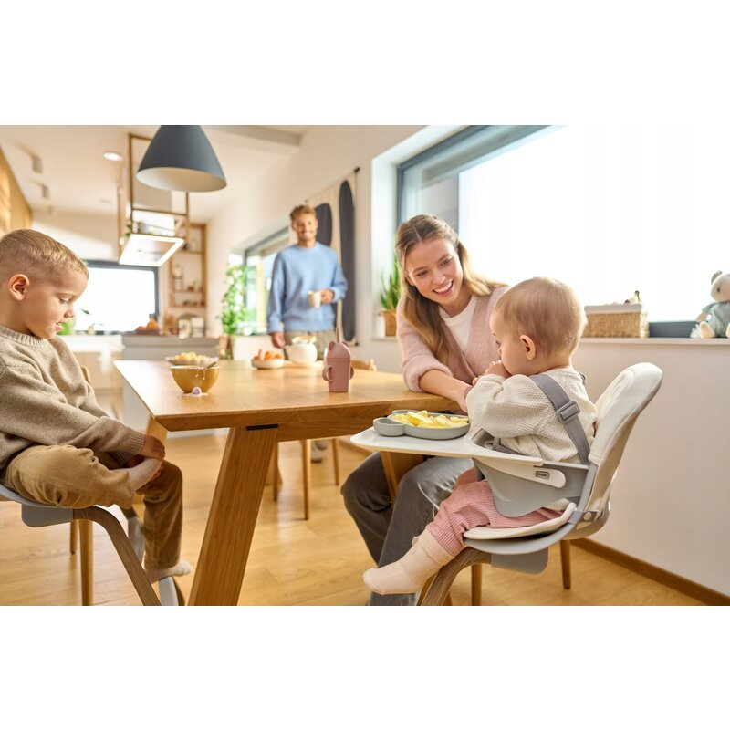 Dalia Set include si un scaun ergonomic de hranire, ideal pentru metoda BLW. Tapiteria confortabila si usor de curatat este potrivita pentru utilizarea zilnica, iar tavita functionala poate fi spalata in masina de spalat vase. Pentru siguranta maxima, sunt incluse centuri de siguranta cu prindere in 5 puncte si reglaj de lungime.