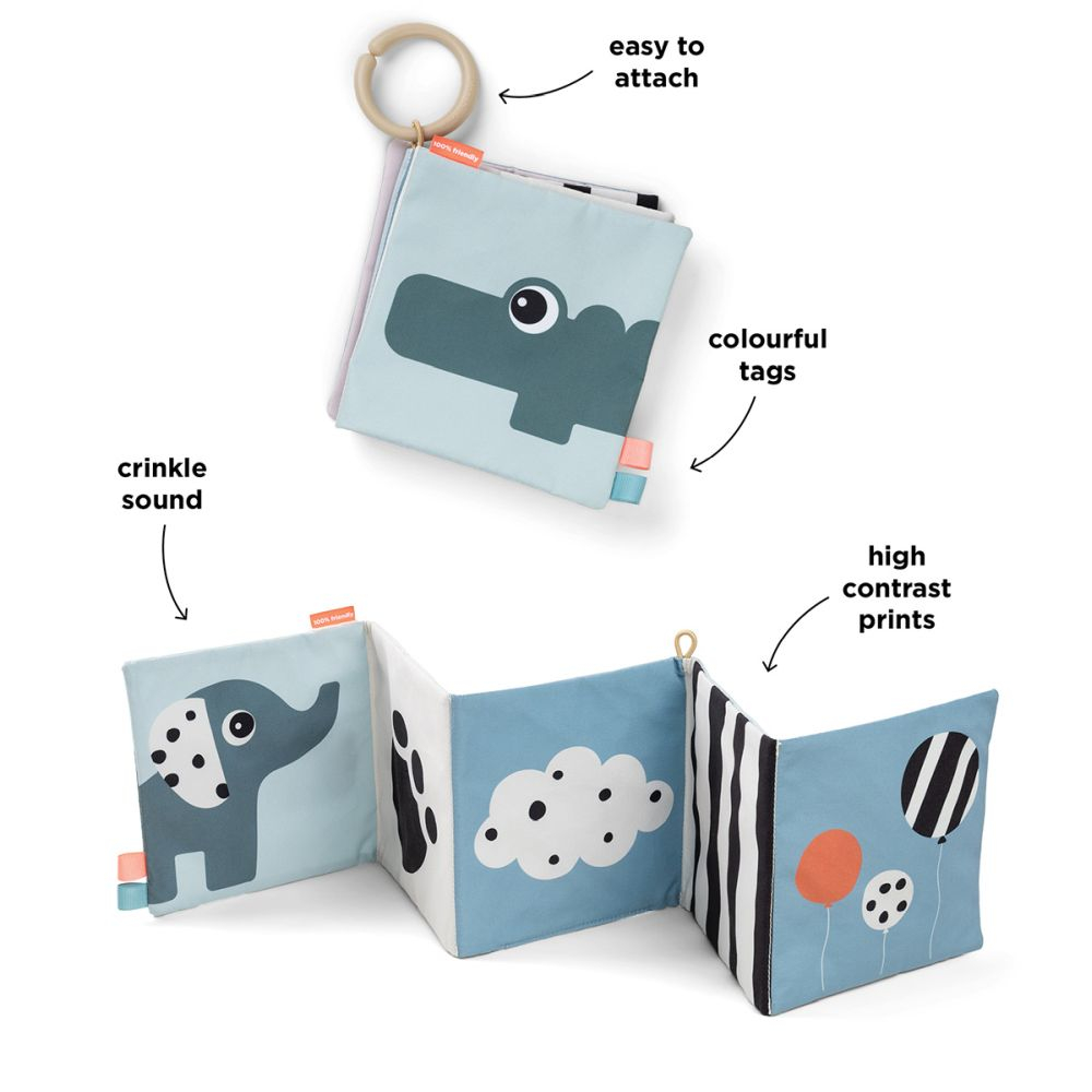 Recomandata de la 0 luni, Jucarie senzoriala carticica de plus Fold Out Done by Deer Colour Mix se foloseste la tummy time pentru a motiva ridicarea capului, la sesiuni scurte de citit si ca divertisment in deplasare. Se pliaza usor pentru a fi luata oriunde.