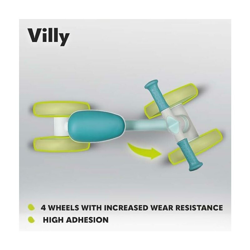 - Stim cat de important este sa asiguram siguranta copilului atunci cand se distreaza! Acesta este motivul pentru care Villy a fost creat astfel incat sa nu se intample nimic copilului dumneavoastra in timp ce se joaca, iar cadrul sau este conceput in armonie cu trupul celui mic. Bicicleta este complet stabila datorita celor patru roti si amortizarii din furca fata. Tractiune excelenta este garantata de roti realizate dintr-o combinatie de spuma EVA si plastic TPR . Bicicleta este echipata si cu blocare a directiei.