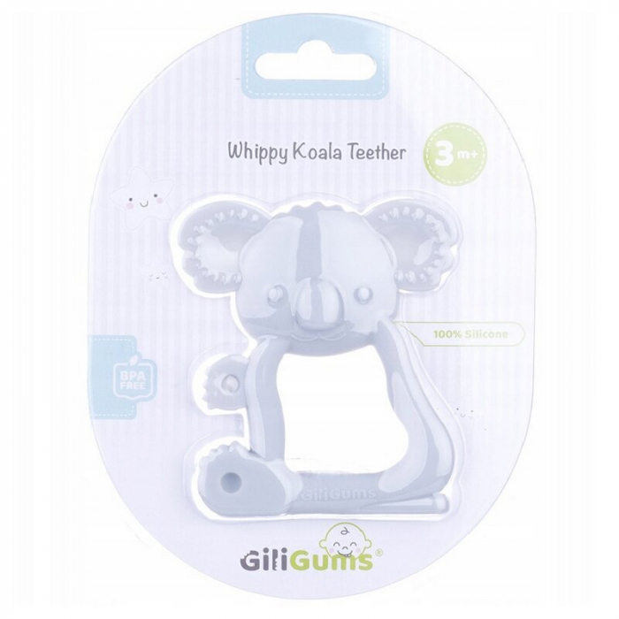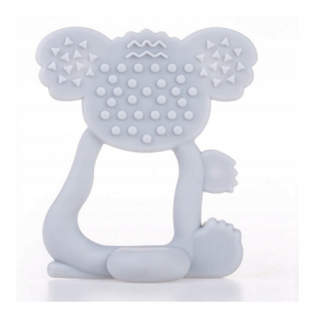 Jucaria koala de silicon are un orificiu in burtica, care faciliteaza prinderea de manutele mici. Este decorat cu proeminente cu texturi variate, care maseaza delicat gingiile copilului, oferind alinare in perioada de dentitie.