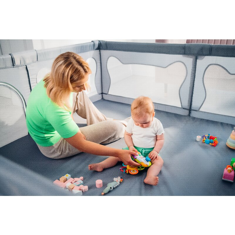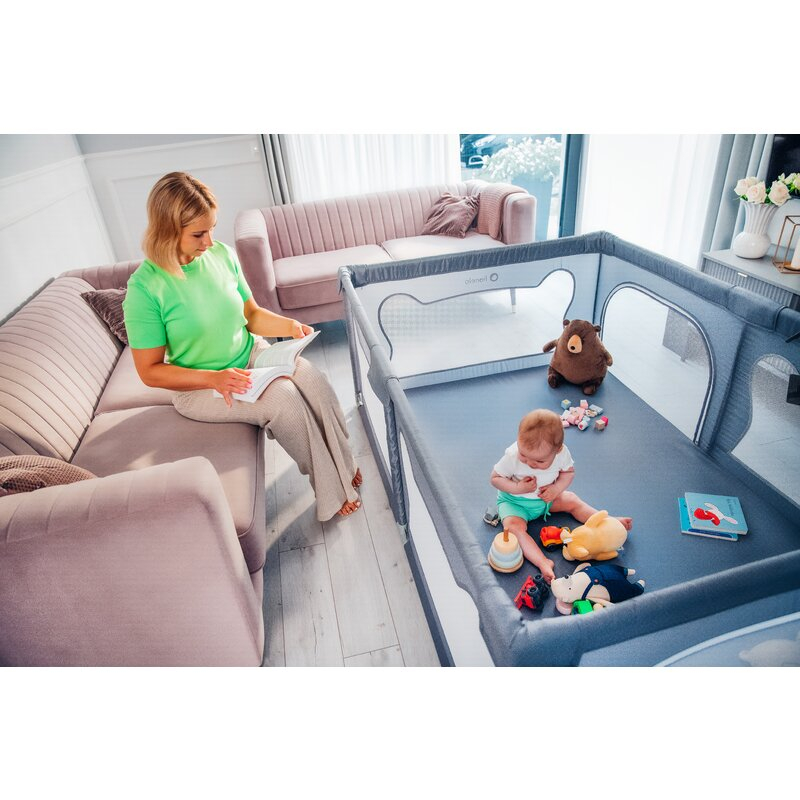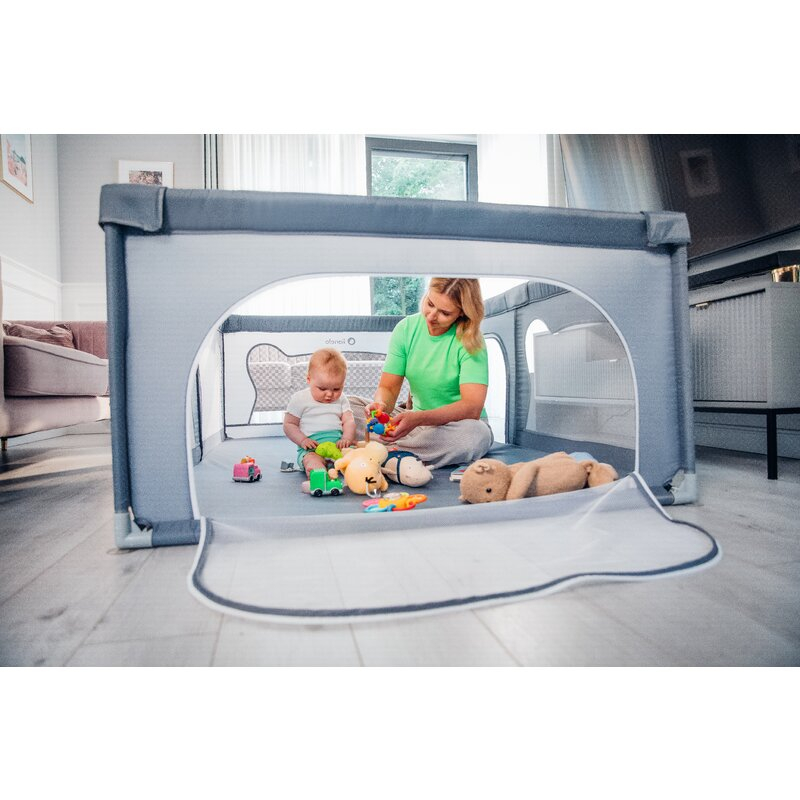 • Zona de joaca inchisa creeaza un mediu curat si sigur pentru copil, cu laturi din plasa pentru o vizibilitate usoara.