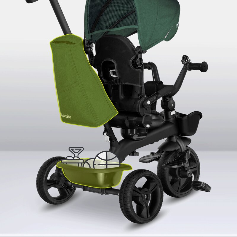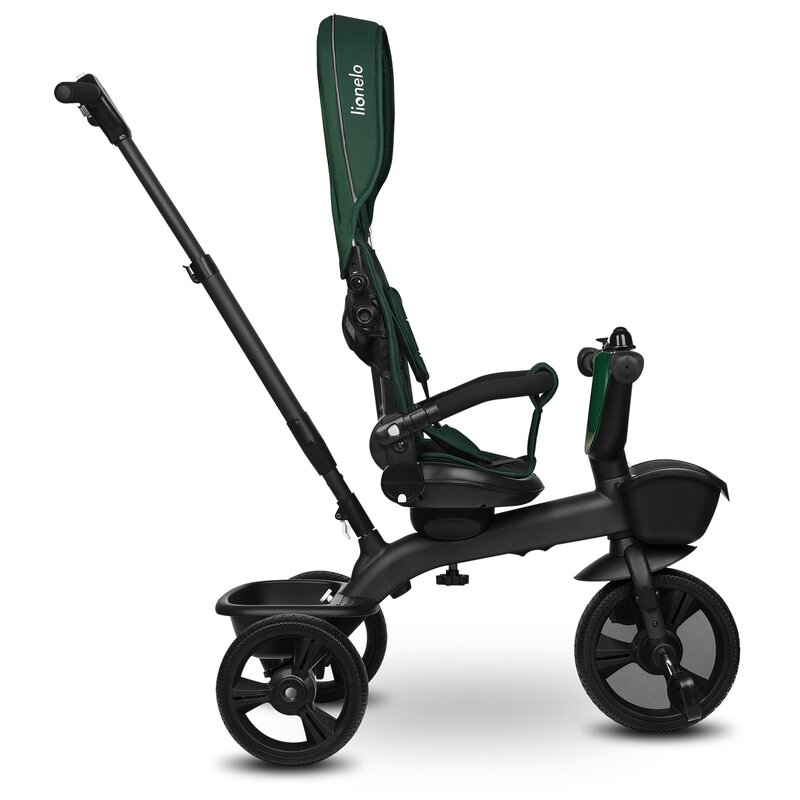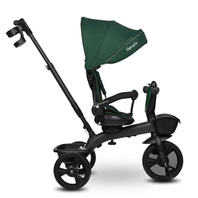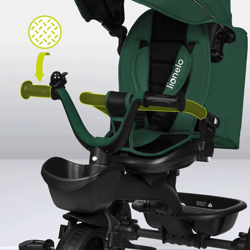 Lionelo Kori este echipata cu o copertina ajustabila pe 3 niveluri, prevazuta cu plasa integrata pentru ventilatie optima. In plus, spatarul tricicletei poate fi reglat pe 3 pozitii, permitand copilului sa stea confortabil in orice situatie. Pentru un plus de functionalitate, produsul vine cu doua cosuri pentru depozitarea accesoriilor esentiale si o geanta practica cu fermoar. Manerul de control parental poate fi accesorizat cu un suport pentru sticla sau cana, ideal pentru plimbarile mai lungi.