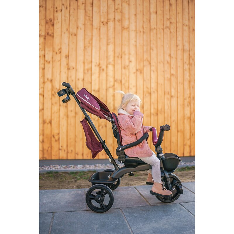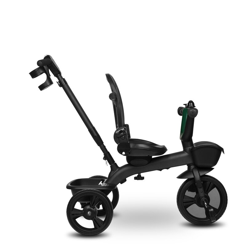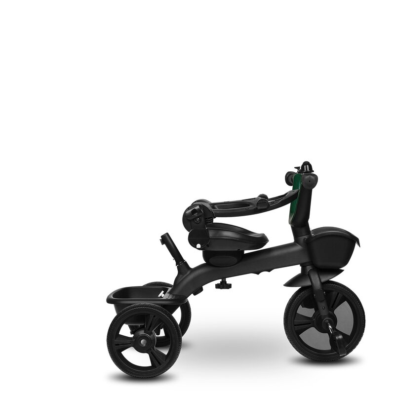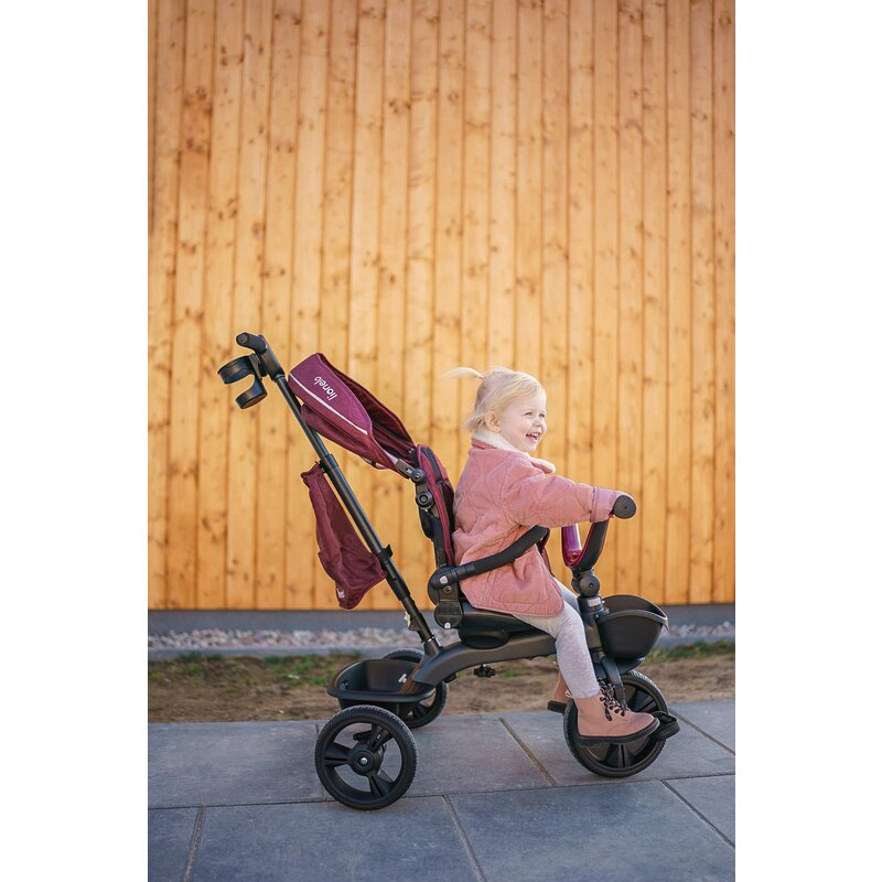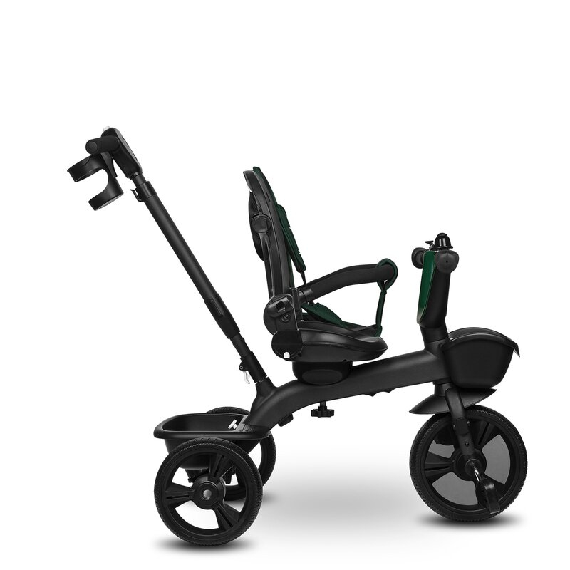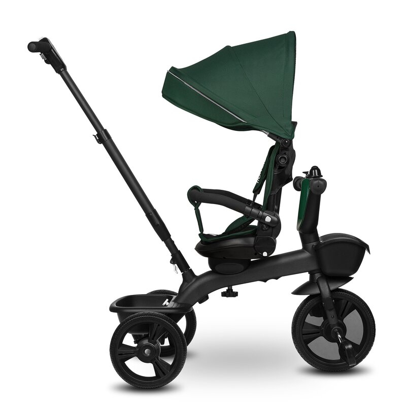 Datorita scaunului rotativ la 360°, copilul poate fi pozitionat fie cu fata, fie cu spatele spre directia de mers, oferind flexibilitate si o interactiune mai usoara cu parintii. Tricicleta poate fi ghidata printr-un maner parental reglabil, oferind control deplin asupra directiei, iar copilul poate pedala simultan. Pe masura ce creste, produsul poate fi ajustat, permitand detasarea manerului si a suportului pentru picioare, transformandu-se astfel intr-o tricicleta clasica.