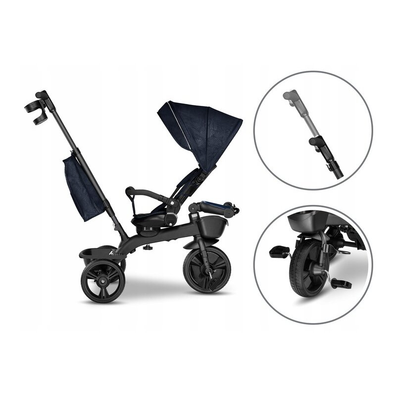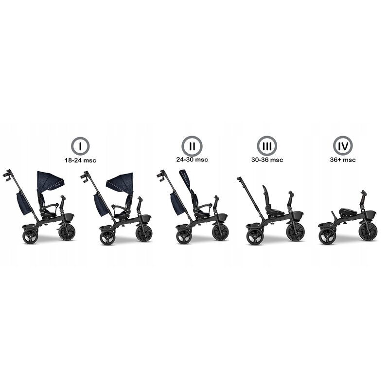 Vehiculul vine cu o umbrela detasabila cu 3 niveluri si o plasa de lumina integrata, precum si cu o ajustare a spatarului pe 3 nivele. Setul include, de asemenea, doua cosuri pentru obiecte indispensabile, precum si o geanta practica cu fermoar. In plus, manerul folosit pentru a controla produsul poate fi completat cu un suport pentru ceasca sau sticla.