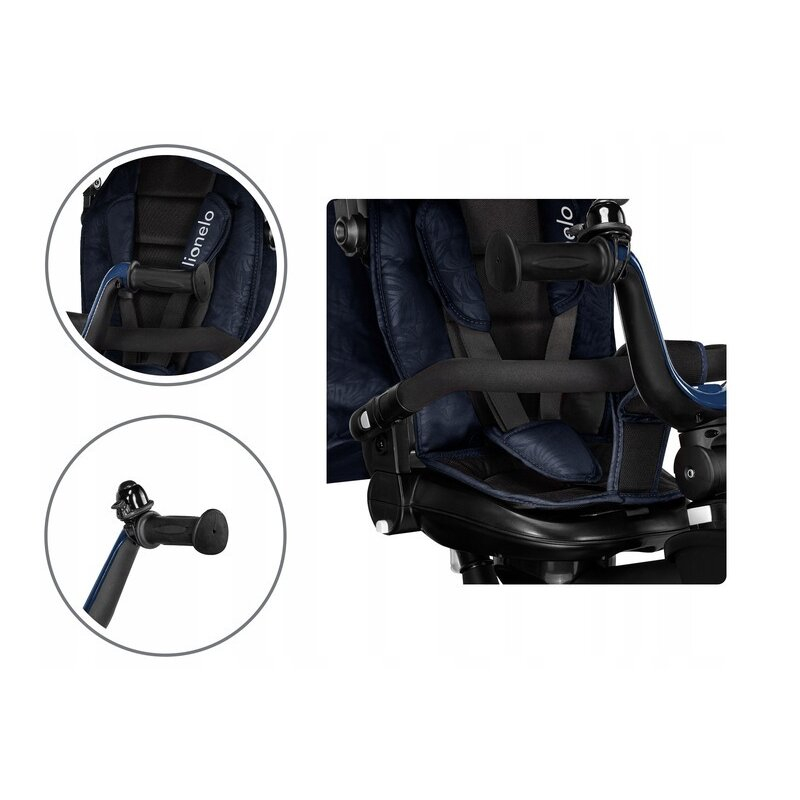 Lionelo Kori este o combinatie intre carucior si triciclu clasic. Deoarece poti schimba pozitia scaunului cu 180 grade, copilul poate calatori in pozitie cu fata sau cu spatele la directia de mers. Produsul poate fi ghidat cu ajutorul unui maner reglabil, iar in acelasi timp, copilul are permisiunea sa pedaleze. Cand micul utilizator este suficient de inalt, poti detasa manerul, suportul pentru picioare si arcada, astfel incat sa devina un vehicul cu pedale.