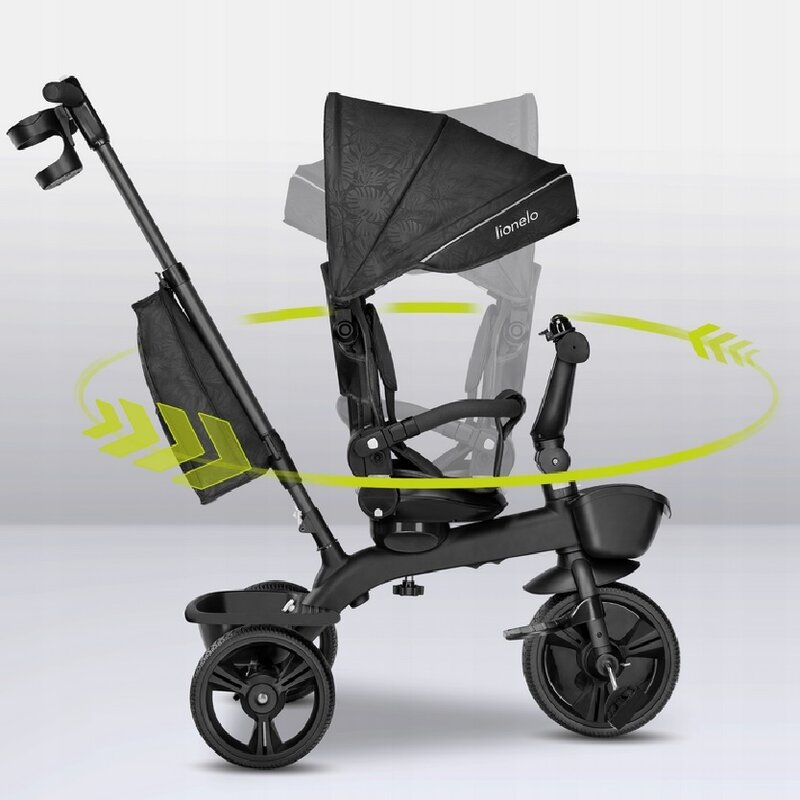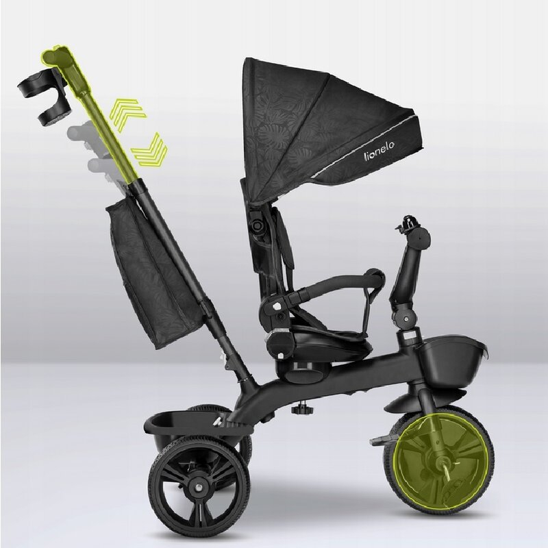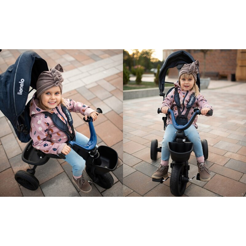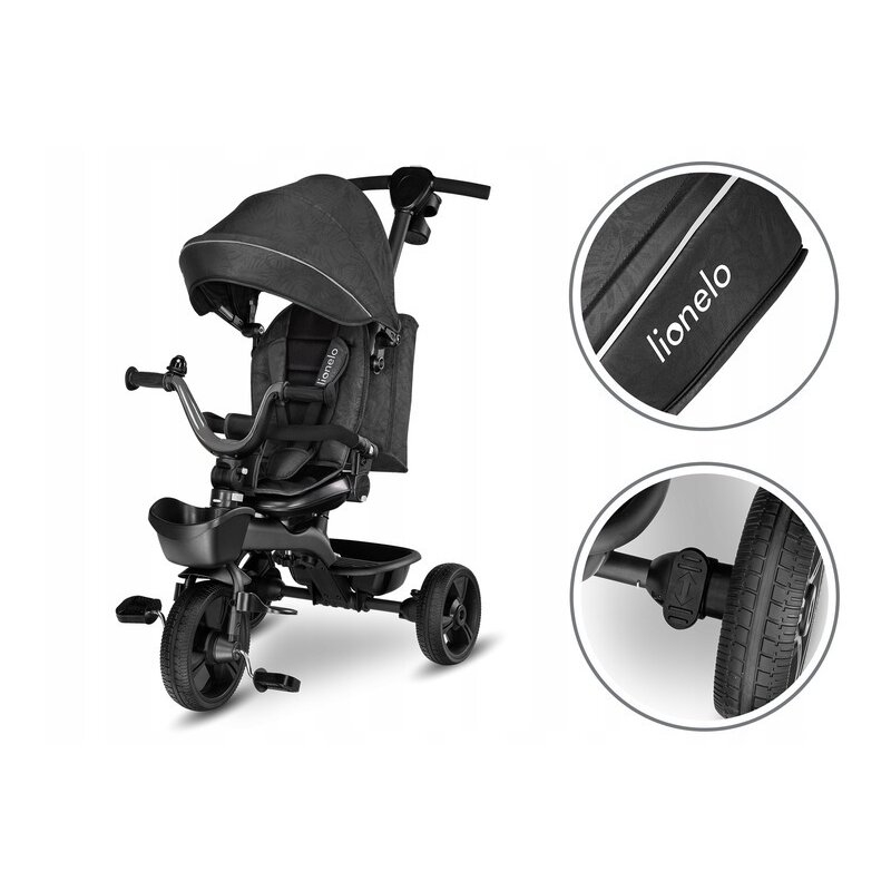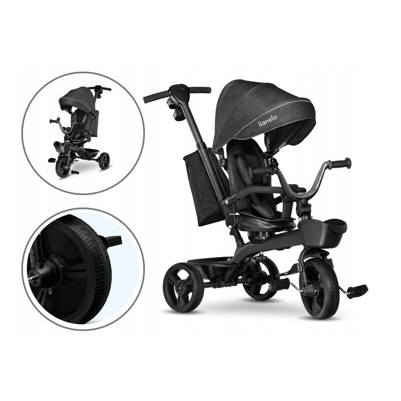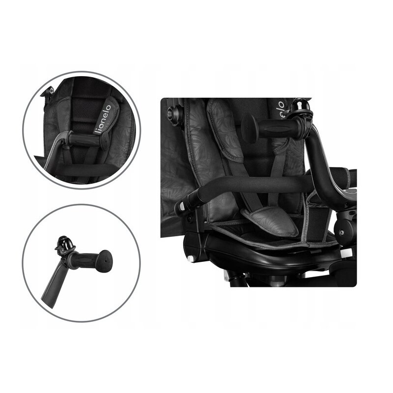 Lionelo Kori este o combinatie intre carucior si triciclu clasic. Deoarece poti schimba pozitia scaunului cu 180 grade, copilul poate calatori in pozitie cu fata sau cu spatele la directia de mers. Produsul poate fi ghidat cu ajutorul unui maner reglabil, iar in acelasi timp, copilul are permisiunea sa pedaleze. Cand micul utilizator este suficient de inalt, poti detasa manerul, suportul pentru picioare si arcada, astfel incat sa devina un vehicul cu pedale.