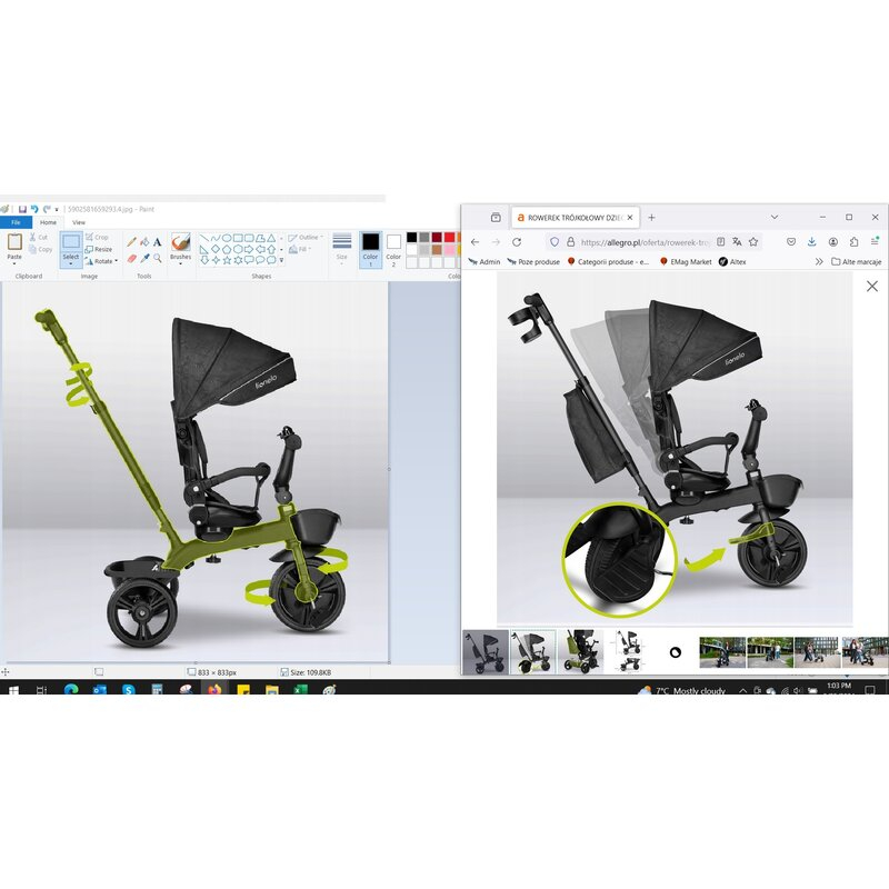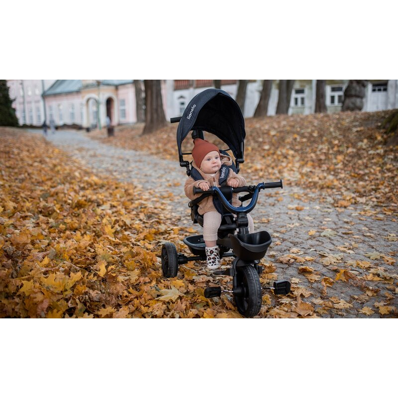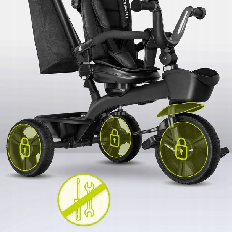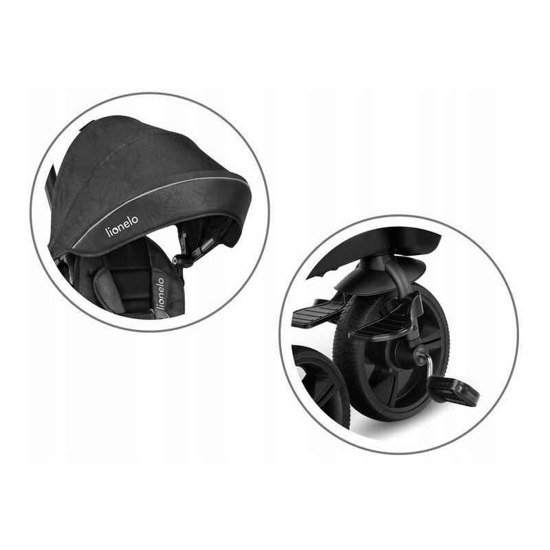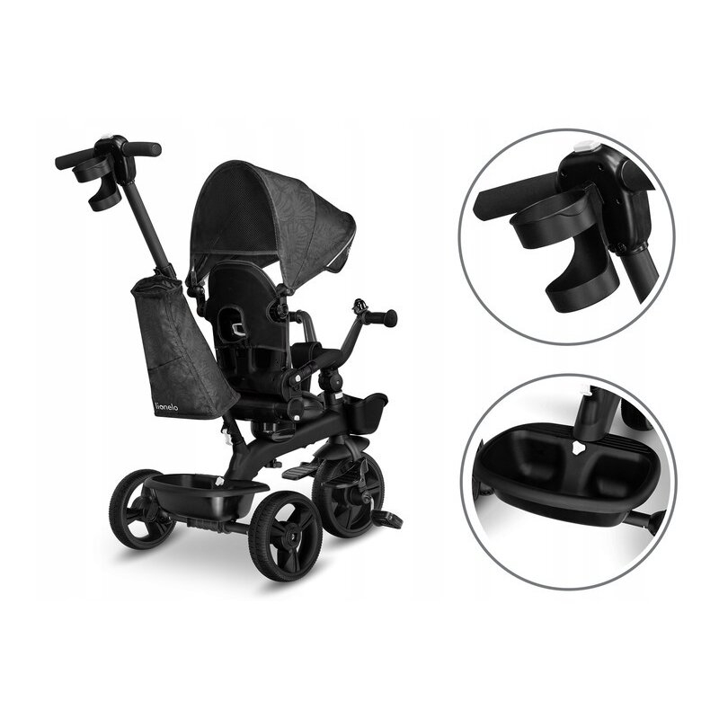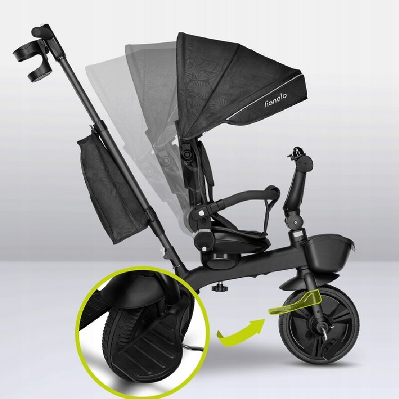 Lionelo Kori este o combinatie intre carucior si triciclu clasic. Deoarece poti schimba pozitia scaunului cu 180 grade, copilul poate calatori in pozitie cu fata sau cu spatele la directia de mers. Produsul poate fi ghidat cu ajutorul unui maner reglabil, iar in acelasi timp, copilul are permisiunea sa pedaleze. Cand micul utilizator este suficient de inalt, poti detasa manerul, suportul pentru picioare si arcada, astfel incat sa devina un vehicul cu pedale.