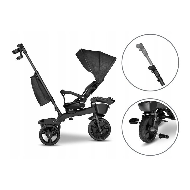 Vehiculul vine cu o umbrela detasabila cu 3 niveluri si o plasa de lumina integrata, precum si cu o ajustare a spatarului pe 3 nivele. Setul include, de asemenea, doua cosuri pentru obiecte indispensabile, precum si o geanta practica cu fermoar. In plus, manerul folosit pentru a controla produsul poate fi completat cu un suport pentru ceasca sau sticla.