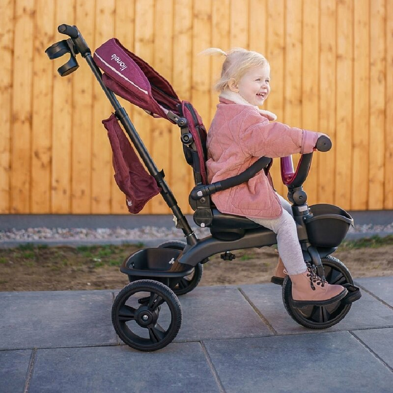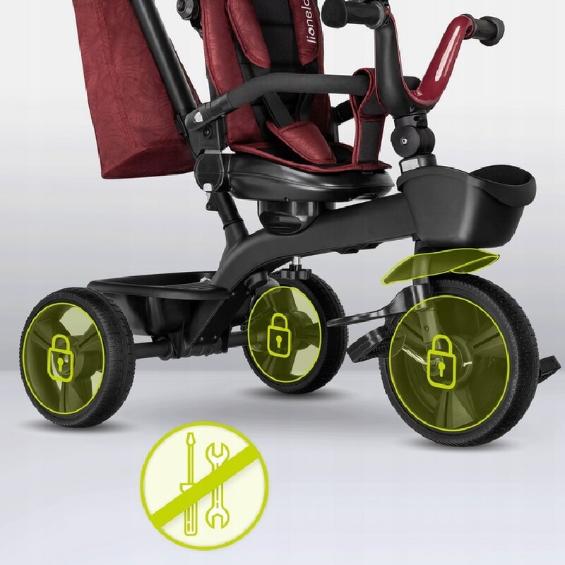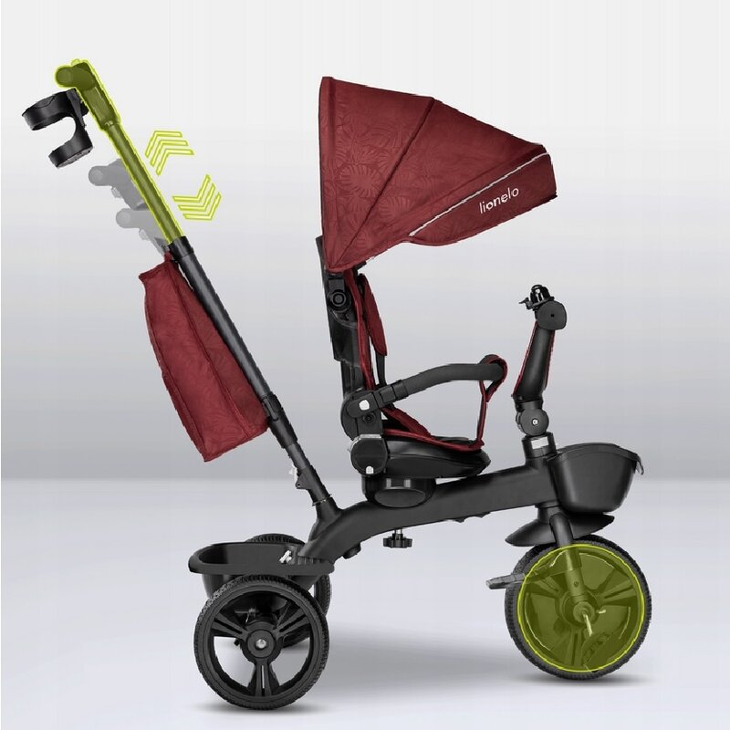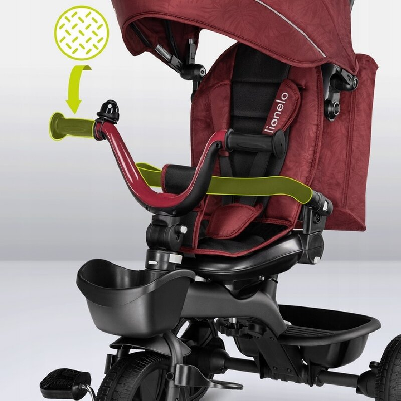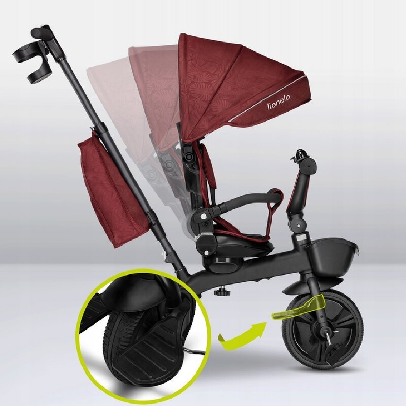 Lionelo Kori este o combinatie intre carucior si triciclu clasic. Deoarece poti schimba pozitia scaunului cu 180 grade, copilul poate calatori in pozitie cu fata sau cu spatele la directia de mers. Produsul poate fi ghidat cu ajutorul unui maner reglabil, iar in acelasi timp, copilul are permisiunea sa pedaleze. Cand micul utilizator este suficient de inalt, poti detasa manerul, suportul pentru picioare si arcada, astfel incat sa devina un vehicul cu pedale.