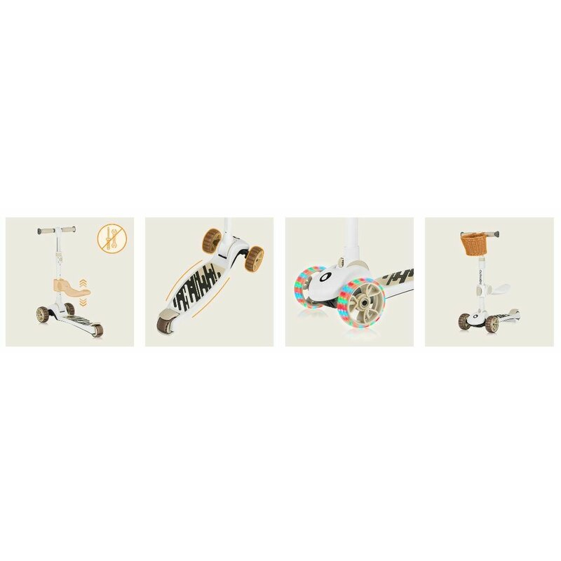 Controlul echilibrului corpului este intuitiv si simplu de invatat pentru copii, permitandu-le sa isi insuseasca rapid echilibrul, prevenind virajele bruste si asigurand o plimbare stabila. Rotile mari imbunatatesc manevrabilitatea si ofera o calitate mai buna a plimbarii. Acestea sunt echipate cu LED-uri colorate activate de miscare, care adauga un plus de distractie in timpul jocului (fara a fi nevoie sa te ingrijorezi de baterii). Cosul montat pe ghidon va tine cele mai importante comori ale micului calator, iar frana profilata, rulmentii fabricati la standardul ABEC-9 si intariturile din fibra de sticla sporesc siguranta. Trotineta poate fi pliata fara a scoate ghidonul - doar apasa un buton si impinge usor. Designul usor al trotinetei o face convenabila pentru transport.