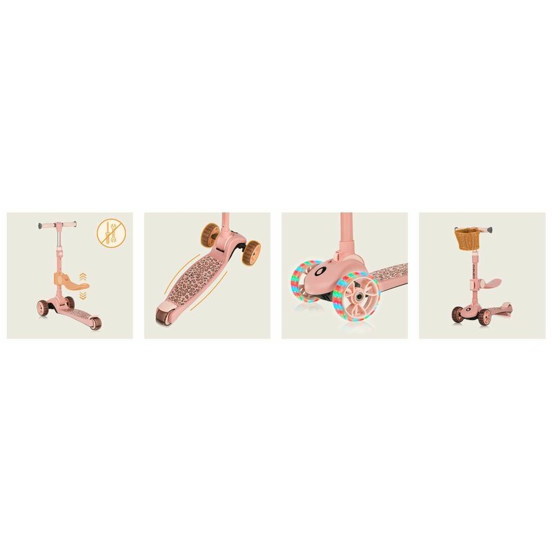 Controlul echilibrului corpului este intuitiv si simplu de invatat pentru copii, permitandu-le sa isi insuseasca rapid echilibrul, prevenind virajele bruste si asigurand o plimbare stabila. Rotile mari imbunatatesc manevrabilitatea si ofera o calitate mai buna a plimbarii. Acestea sunt echipate cu LED-uri colorate activate de miscare, care adauga un plus de distractie in timpul jocului (fara a fi nevoie sa te ingrijorezi de baterii). Cosul montat pe ghidon va tine cele mai importante comori ale micului calator, iar frana profilata, rulmentii fabricati la standardul ABEC-9 si intariturile din fibra de sticla sporesc siguranta. Trotineta poate fi pliata fara a scoate ghidonul - doar apasa un buton si impinge usor. Designul usor al trotinetei o face convenabila pentru transport.