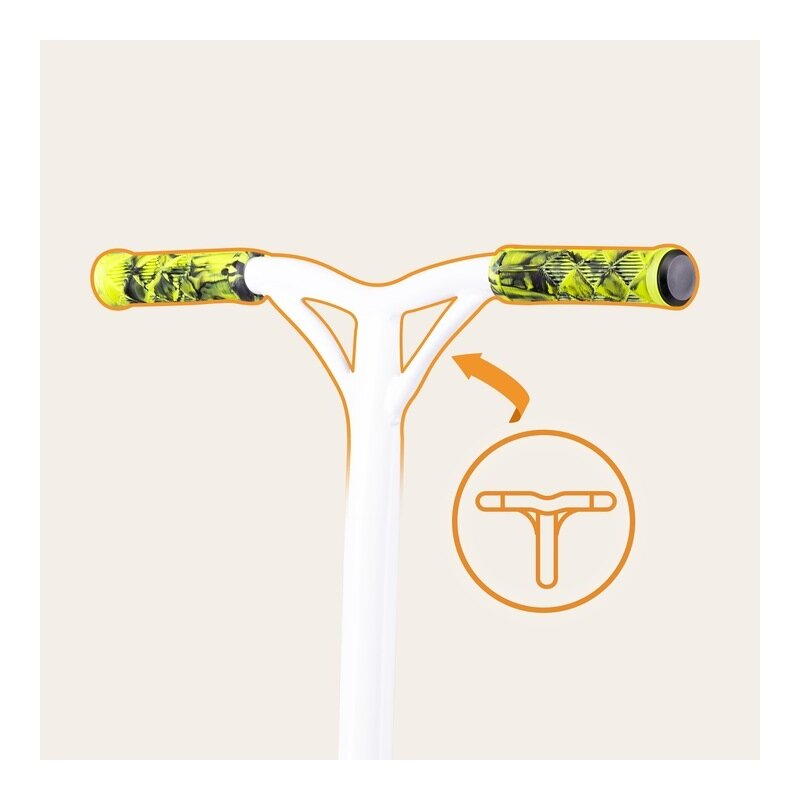 Ghidonul ergonomic, dintr-o singura bucata, cu bara in Y, cu o clema cu 4 gauri, asigura o pozitie adecvata de mers si ofera o ergonomie superioara pentru a efectua trucuri si a conduce fara efort. Manerele speciale din cauciuc impiedica alunecarea mainilor. Puntea conturata si spatioasa permite pozitionarea confortabila a piciorului.