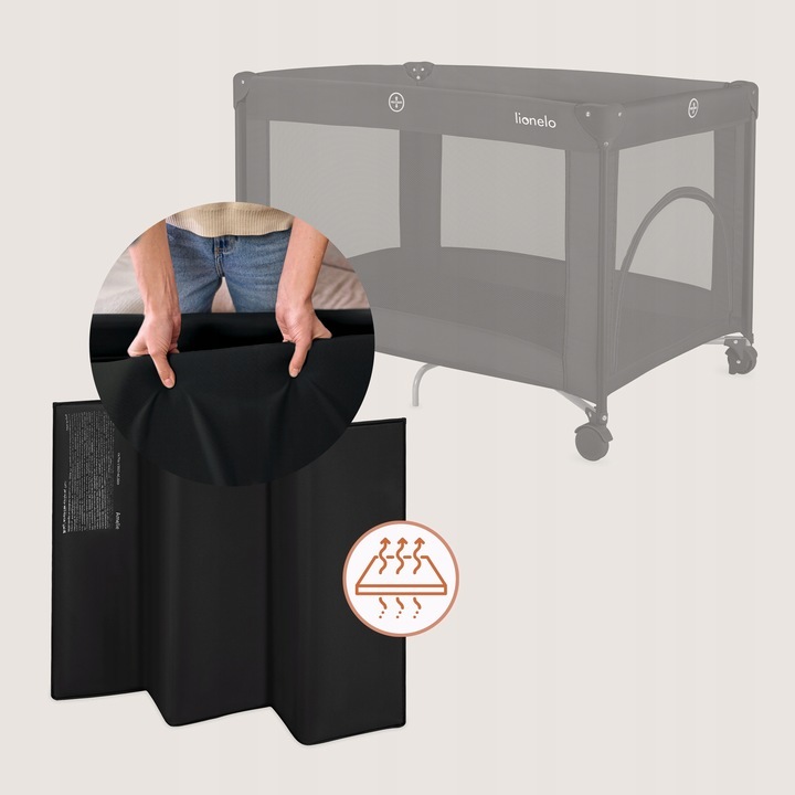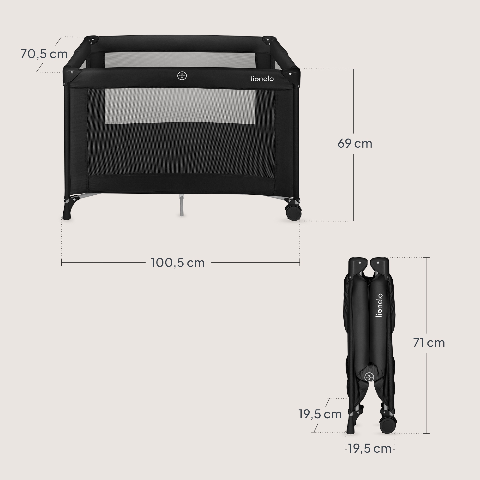 Patut pliant, Lionelo, Amelie, Cu intrare laterala, 100.5×70.5 cm, Include salteluta, roti, geanta pentru transport, Constructie usoara- 7 kg, Cadru stabil din otel, Negru