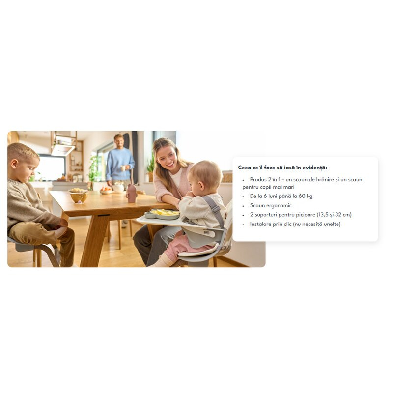 Cadrul scaunului este stabil, oferind siguranta maxima, mai ales pentru cei mai mici copii. In plus, inaltimea sa a fost adaptata la mesele standard, ceea ce imbunatateste confortul in timpul meselor impreuna.