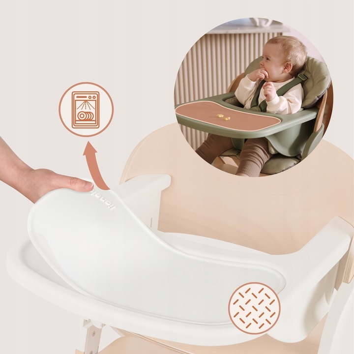 Împreună cu scăunelul primești o tavă practică cu adâncitură, care împiedică alunecarea alimentelor. Pe ea poți pune antiderapantă din silicon. Aceasta poate fi folosită și direct pe masă, iar după masă, se spală fără probleme în mașina de spălat vase.