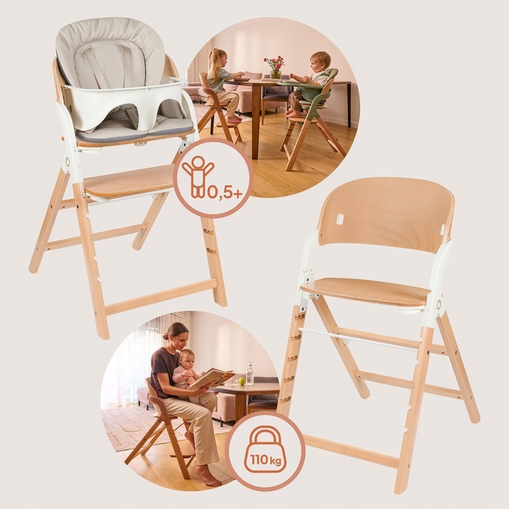 Scăunelul are înălțimea potrivită pentru mesele standard, astfel încât oricine – indiferent de vârstă (chiar și cel mai mic membru al familiei) – va putea participa confortabil la mesele comune.