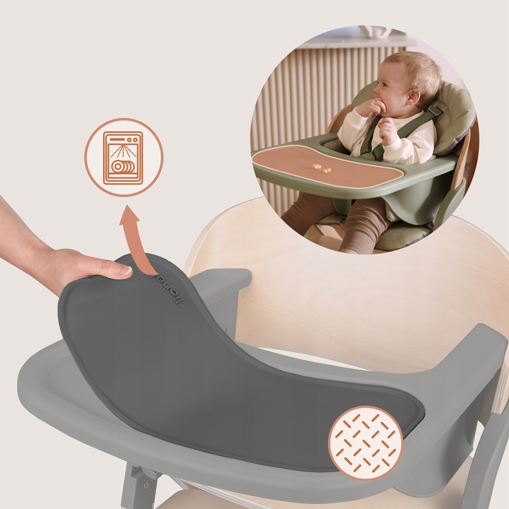 Împreună cu scăunelul primești o tavă practică cu adâncitură, care împiedică alunecarea alimentelor. Pe ea poți pune antiderapantă din silicon. Aceasta poate fi folosită și direct pe masă, iar după masă, se spală fără probleme în mașina de spălat vase.