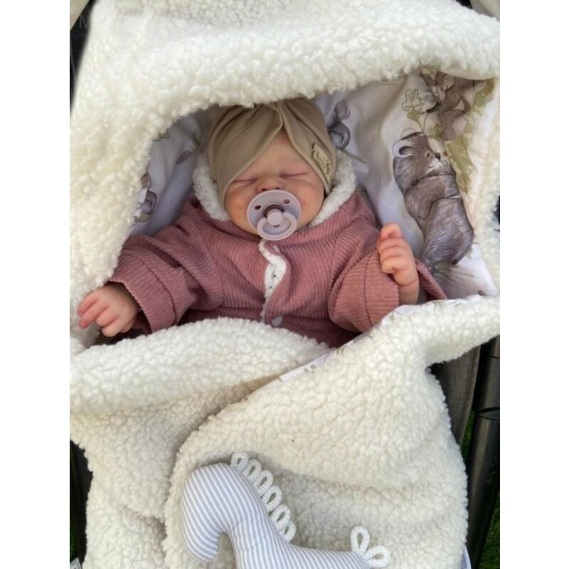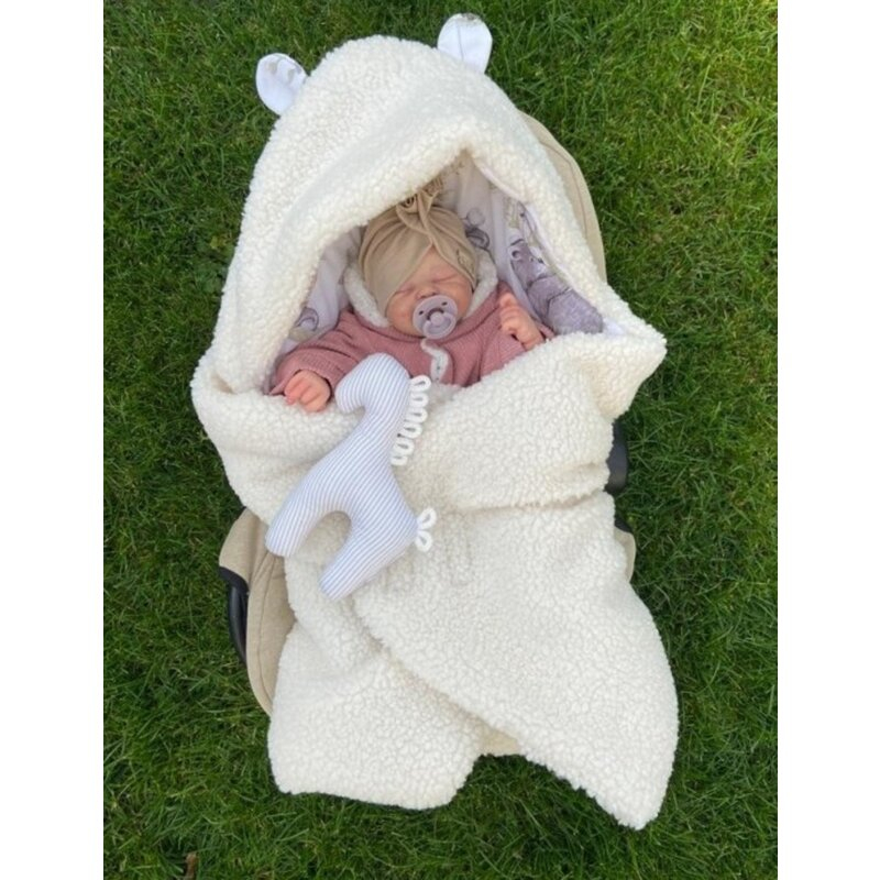 Paturica calduroasa de infasat, MimiNu, Pentru scoica, scaun auto/carucior, Cu gluga si urechi, Cu sistem de prindere pe baza de velcro, Dimensiune 90x90 cm, Din imitatie de lana si bumbac, Certificat